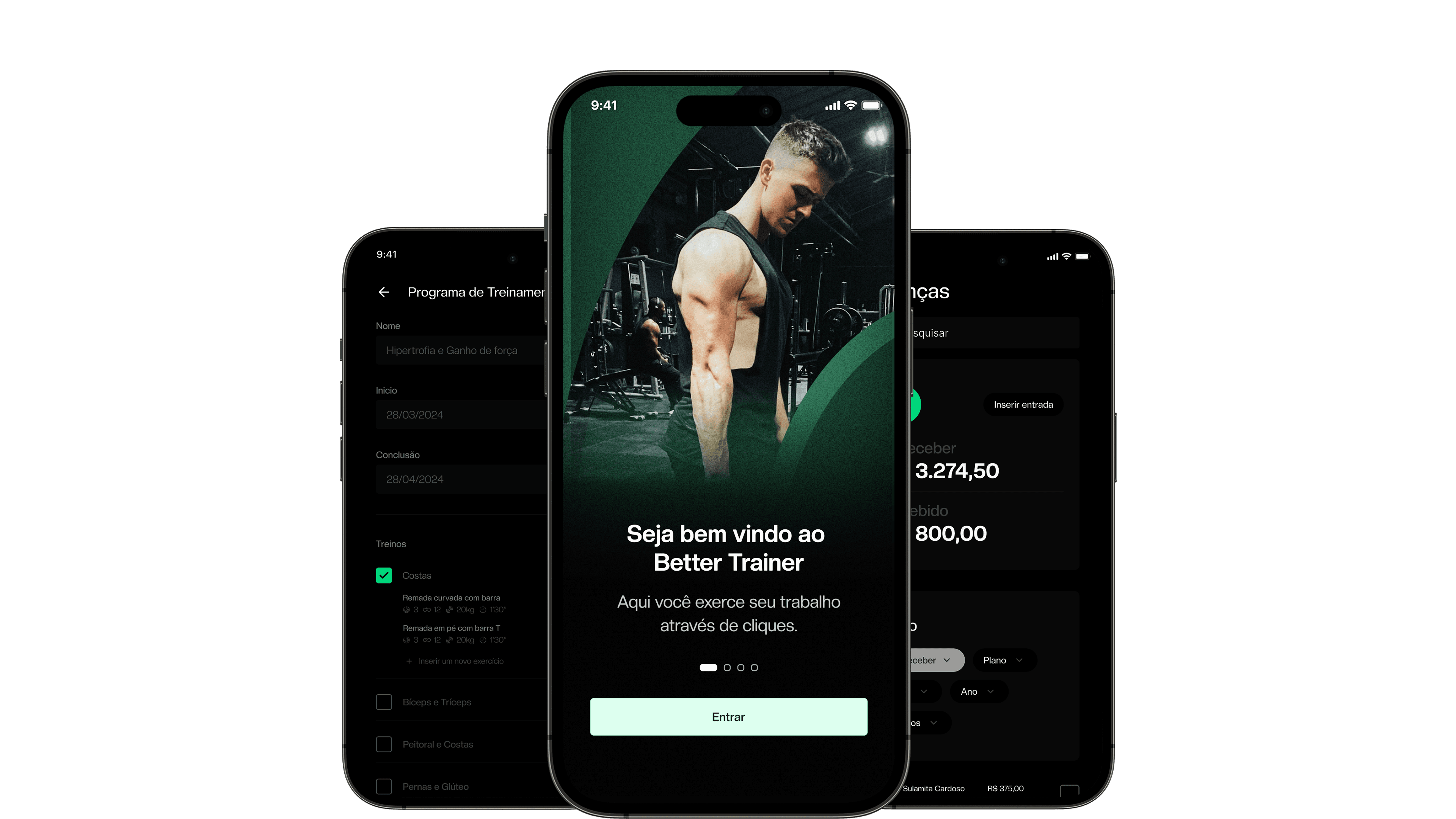 Tenha controle total da sua consultoria de Personal Trainer. Gerenciamento de finanças, treinos e progresso dos seus alunos em um só lugar.